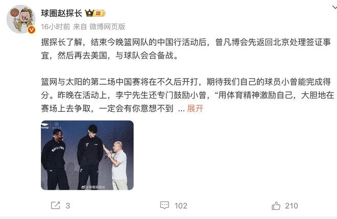 首先在本场中国赛结束之前,媒体人已经在社交平台透露了曾凡博接下来的去向问题。他表示曾凡博接下来结束了中国赛之后,暂时不会跟随球队一起去往美国,而是留在国内办理签证的问题。晚一些再出国和他们的队友会合。接下来也意味着曾凡博应该在短时间之内不会被篮网队裁掉。